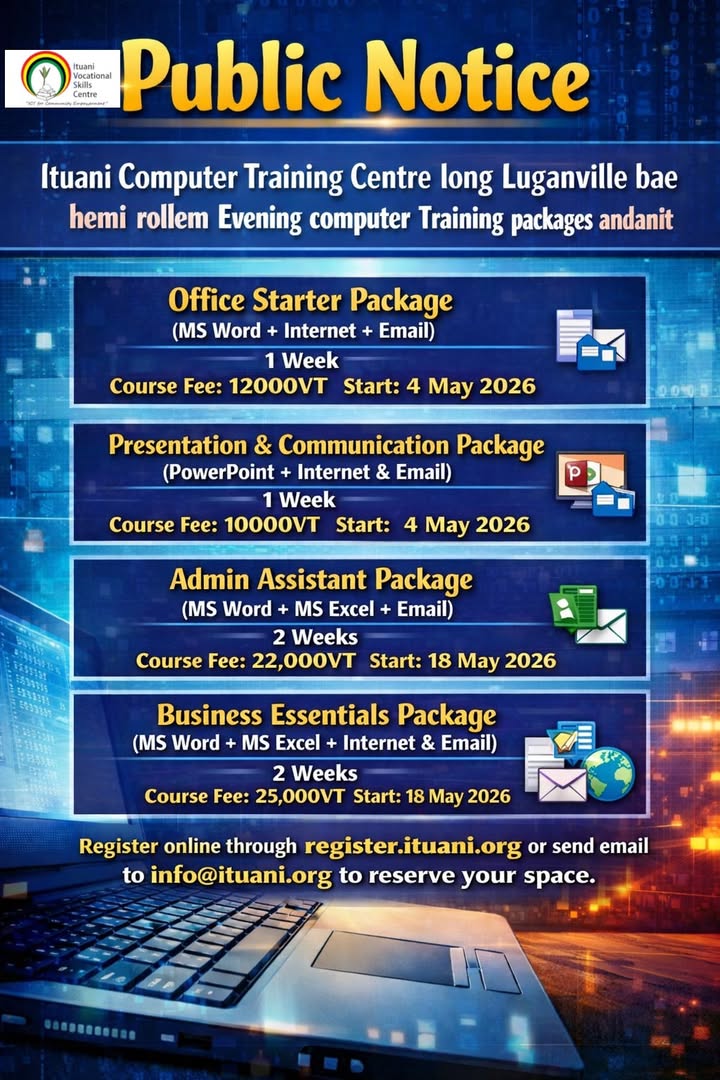 In 2018, the Ituani ICT Centres were rebranded as the Ituani Vocational Skills Centre (IVSC), which expanded its ICT for Education and Development program. In 2019, IVSC became the first RTC in Vanuatu to deliver computer courses to the rural population (comprising 70% of the country), and to offer recognized certification that opens doors for students to further their studies in ICT or apply their new skills in business or employment opportunities.